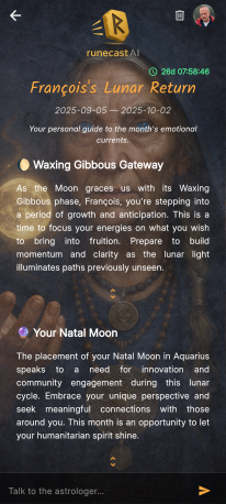 Daily Horoscope: Begin each day with personal insights shaped by the stars. Challenges become courage, opportunities become clarity. Lunar Return: Each month, when the Moon returns to its birth position, your Guide offers a compass for the emotional cycle ahead—precisely tuned to your chart, your moment, your place.